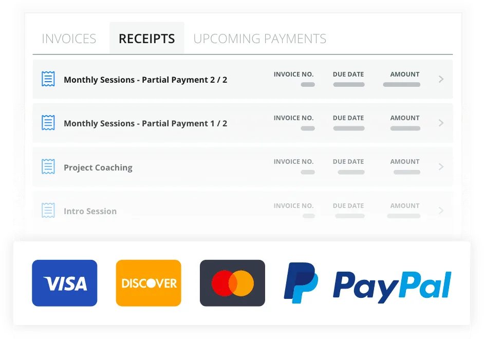 Process payments (credit card, PayPal, cash, check, barter, or waiver) and send email receipts to your clients. Clients can also log in to the secure client portal to process their own payment.