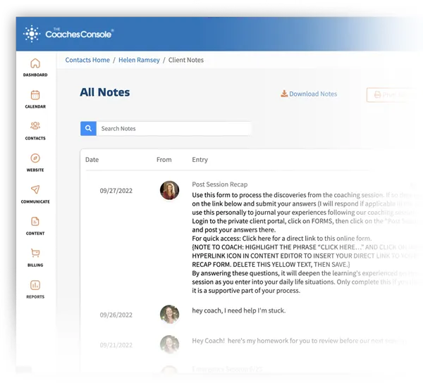 The Client Log organizes and tracks all interactions between coach and client outside of the coaching sessions.