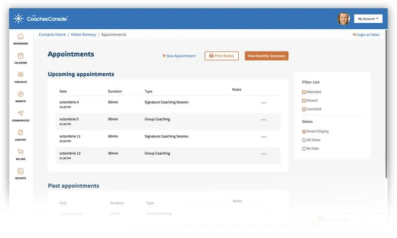 In addition to your main calendar, each of your clients will have their specific appointments organized in their client file. Resend appointment reminders, take notes and use the timer to track your coaching hours.