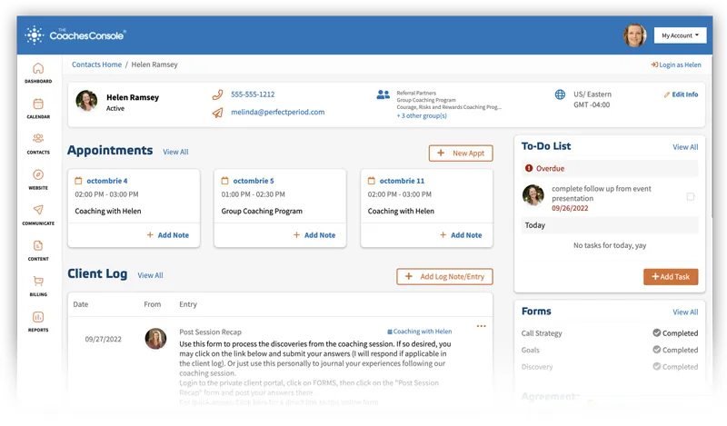 Your client answers to their Call Strategy Form, your personal (and private) notes as well as any follow-up session notes will be organized by appointment date and time; easy for you to access.