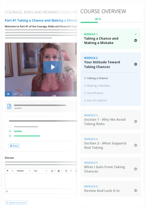Launch your first course instantly with our built-in 8-module "Courage, Risks, and Rewards" courses. Suitable for every niche, this course can be sold as a product or offered for free in order to attract new leads.
