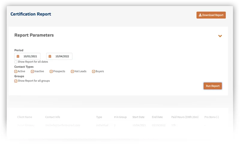 Track paid and pro-bono hours in an ICF-formatted report. Review the report monthly, or easily download it to send with your certification material.