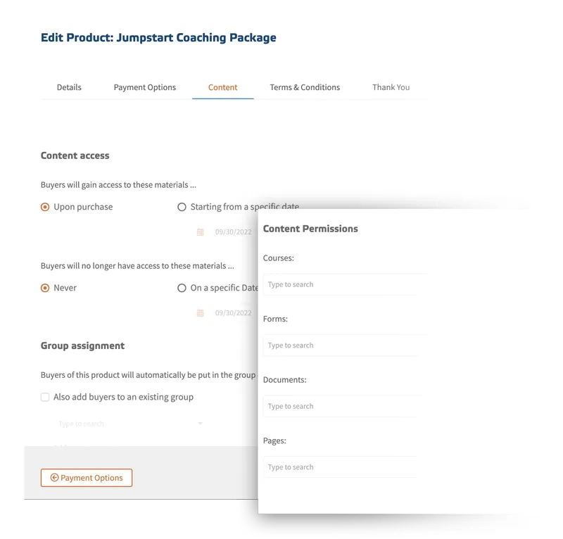 Provide access to content (such as courses, private web pages, interactive forms, downloadable documents, and discussion posts) for each new buyer.