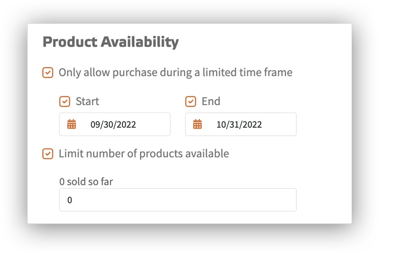 Customize ‘cart open’ options to sell products at any time or only during a specified date range.